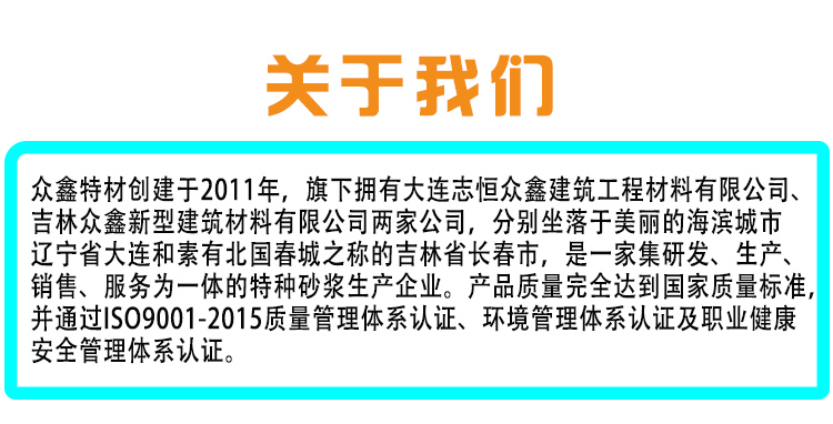 大連志恒眾鑫專業生產銷售風電灌漿料,強度80Mpa,100Mpa,110Mpa,適用二次灌漿,設備基礎灌漿,我們是大連灌漿料廠家,長春灌漿料廠家,有環氧砂漿,套筒灌漿料,PC座漿料、自流平砂漿等50多種產品,可滿足您不同需求,有任何技術難題歡迎來電咨詢:400-0411-552 眾鑫特材期待您的光臨!